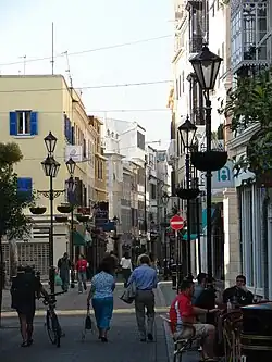 Main Street (Spanish: Calle Real) is the main arterial street in Gibraltar and its main commercial and shopping district.[40] The street runs north–south through the old town which is pedestrianised and lined with buildings displaying a blend of Genoese, Portuguese, Andalusian, Moorish and British Regency styles,[40] most of which have shops on the ground floor. Upper floors provide residential accommodation or offices. It contains wide variety of shops, many of which are familiar from British high streets such as a branch of Marks & Spencer. Gibraltar's town centre is largely protected by the Gibraltar Heritage Trust and is part of a continual restoration programme.[40]