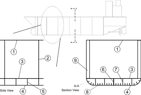 This diagram shows the key structural elements of a ship's main hull (excluding the bow, stern, and deckhouse).