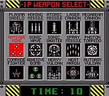 Using the Strike Gunner, the player is armed with a dual red laser weapon that can be upgraded several times to a more powerful blue laser. In addition to this weapon, the player chooses a second, more powerful "special weapon" with a limited charge before they begin the mission. There are 10 advanced weapons (15 in the SNES version) to pick from. This allows for a strategic approach to the game because certain weapons are more effective on certain missions. The "special weapon" has various limitations, depending on which one is being used.
