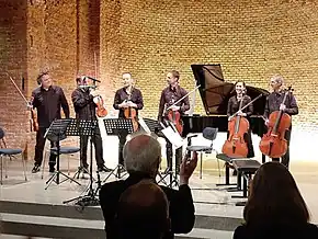 After the first performance at Highgate school, the first movement was performed again at chamber concert at Cambridge University in 1982.[1] The completed version was first performed at the Gasteig in Munich on 9 February 2014 in a program of chamber music by Mozart and Waterhouse, with the members of the Munich Philharmonic and the composer as the cellist.[4] The UK premiere was played on 1 May 2016 as part of the Whittall Barn Concert Series by the Anern Trio and the Waterhouse Trio, along with the string trios Zeichenstaub and Epitaphium.[5][6] The sextet was notably played as part of GW60, a concert on 5 November 2022 at the Allerheiligen-Hofkirche in Munich to celebrate the composer's 60th birthday.[2]: 4 [7] The performers were David Frühwirth, Clément Courtin, Konstantin Sellheim, Valentin Eichler, Katerina Giannitsioti and the composer.[2]: 5