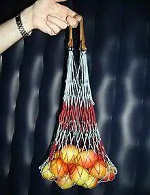 A string bag, net bag, or mesh bag is an open netted bag. Mesh bags are constructed from strands, yarns, or non-woven synthetic material into a net-like structure. String bags are used as reusable shopping bags[1] and as packaging for produce.[2]