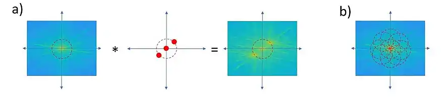 The theory behind SIM is best understood in the Fourier or frequency domain. In general, imaging systems can only resolve frequencies below the diffraction limit. Thus, in the Fourier domain, all recorded frequencies from the imaged sample would reside within a circle of a fixed radius. Any frequencies outside this limit cannot be resolved. However, the frequency spectrum can be shifted by imaging the sample with patterned illumination. Most often, the pattern is a 1D sinusoidal gradient, such as the pattern used to create the Moiré fringes in the above image. Because the Fourier transform of a sinusoid is a shifted delta function, the transform of this pattern will consist of three delta functions: one at the zero frequency and two corresponding to the positive and negative frequency components of the sinusoid (see below image). When the target is illuminated using this pattern, the target and illumination pattern are multiplicatively superimposed, which means the Fourier transform of the resulting image is the convolution of the individual transforms of the target and the illumination pattern. Convolving any function with a delta function has the effect of shifting the center of the original function to the location of the delta function. Thus, in this situation, the frequency spectrum of the target is shifted and frequencies that were previously too high to resolve now lie within the circle of resolvable frequencies. The result is that for a single image acquisition with SIM, the frequency components from three separate regions in the Fourier domain (corresponding to the center and the positive and negative shifts) are all captured together. Finally, because rotation in the spatial domain results in the same rotation in the Fourier domain, high frequencies over the full 360° can be captured by rotating the illumination pattern. Figure b) in the image below shows which frequency components would be captured by acquiring 4 separate images and rotating the illumination pattern by 45° in between each acquisition.