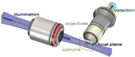 With interfering light sheets, two coherent counterpropagating sheets are sent into the sample.[1] The interference pattern between these sheets creates the desired illumination pattern, which can be rotated and scanned using rotating mirrors to deflect the sheets. Additional flexibility can be added by using digital light-sheet microscopy to generate the illumination patterns. In digital LSM, the light sheet is created by rapidly scanning a laser beam through the sample.[3][2][14] This allows for fine control over the specific illumination pattern by modulating the intensity of the laser as it scans. This technique has been used to create systems capable of multiple types of light sheet microscopy in addition to SI-LSM.[2][3] Finally, spatial light modulators can be used to electronically control the light patterns, which has the advantage of allowing for very fine control of and fast switching between patterns.[15][16]