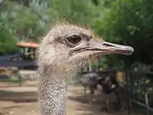 The first species of Struthio appear during the Miocene epoch, though various Paleocene, Eocene, and Oligocene fossils may also belong to the family.[4][5] Ostriches are classified in the ratite group of birds, all extant species of which are flightless, including the kiwis, emus, and rheas. Traditionally, the order Struthioniformes contained all the ratites. However, recent genetic analysis has found that the group is not monophyletic, as it is paraphyletic with respect to the tinamous, so the ostriches are usually classified as the only members of the order,[6][7] though the IUCN uses a broader classification and includes all "ratites" and tinamous in Struthioniformes.[8]