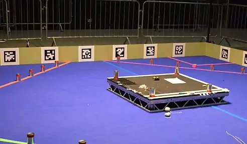 Student Robotics is a registered charity that runs an annual robotics competition for teams of 16 to 19 year-olds.[1] The charity aims to foster a world where engineering and artificial intelligence is accessible to young people with a stated mission "to bring the excitement of engineering and the challenge of coding to young people through robotics".[2] The competition is free to enter and teams are provided with all of the core electronics that they need to build a robot. To encourage creative and ingenious solutions to problems, constraints on design (other than overall size) are kept to a minimum, and the students can build and fashion their robots with any materials they choose; this results in a wide range of quirky, original robots. The robots must operate autonomously; once they are switched on to compete no interference from the team is allowed.[3]