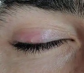 A stye, also known as a hordeolum, is a bacterial infection of an oil gland in the eyelid.[4] This results in a red tender bump at the edge of the eyelid.[1][5] The outside or the inside of the eyelid can be affected.[3]