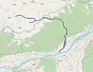 Tsari Chu (Chinese: 洛河; pinyin: Luò hé, "Lo River"; known as Lensi River in Arunachal Pradesh)[7] rises near the village of Chosam in Tibet and flows east for about 25 miles till the town of Migyitun, where it turns south. It merges with the Subansiri at Gelensiniak.[8][9] The district of Tsari, consisting of the Tsari Chu valley and its vicinity, is considered holy ground by the Tibetans. No animals are killed and no food is grown in these areas, with the exception of Migyitun.[10] The holiness comes from the Dakpa Sheri mountain peak at the centre of the Tsari district, considered the home of the Buddhist Tantric deity Demchok (Chakrasamvara) and his consort Dorje Phagmo (Vajravārāhī). The pious Tibetans used to carry out a wide circumabulation (called rongkor or "ravine circuit") around the mountain once every 12 years, during the monkey year. They traversed the valley of the Tsari Chu river until its junction with Subansiri, and returned via the Subansiri and Yume Chu valleys.[11] The last such circumambulation took place in 1956, after which the Sino-Indian border conflict has put an end to the practice.