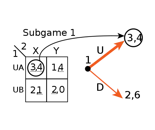 For the entire game Nash equilibria (DA, Y) and (DB, Y) are not subgame perfect equilibria because the move of Player 2 does not constitute a Nash Equilibrium. The Nash equilibrium (UA, X) is subgame perfect because it incorporates the subgame Nash equilibrium (A, X) as part of its strategy.[3]