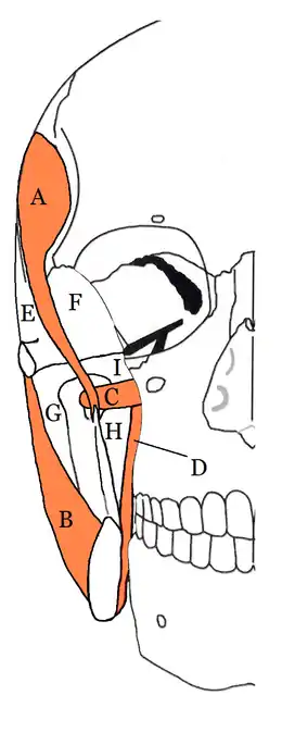 ![]() The four compartents of the right masticator space. A Temporalis muscle, B Masseter muscle, C Lateral pterygoid muscle, D Medial ptaerygoid muscle, E Superficial temporal space, F Deep temporal space, G Submasseteric space, H Pterygomandibular space, I Approximate location of infratemporal space | |