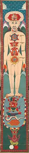 Subtle body concepts and practices can be identified as early as 2nd century BCE in Taoist texts found in the Mawangdui tombs.[1] It was "evidently present"[1] in Indian thought as early as the 4th to 1st century BCE when the Taittiriya Upanishad described the Panchakoshas, a series of five interpenetrating sheaths of the body.[2] A fully formed subtle body theory did not develop in India until the tantric movement that affected all its religions in the Middle Ages.[1] In Indo-Tibetan Buddhism, the correlation of the subtle body to the physical body is viewed differently according to school, lineage and scholar, but for completion stage in yoga, it is visualised within the body.[3] The subtle body consists of focal points, often called chakras, connected by channels, often called nadis, that convey subtle breath, often called prana. Through breathing and other exercises, a practitioner may direct the subtle breath to achieve supernormal powers, immortality, or liberation.