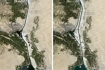 The New Suez Canal (Egyptian Arabic: قناة السويس الجديدة Kanāt El Sewēs El Gedīda) is an artificial waterway project in Egypt which created a second shipping lane along part of the Suez Canal, and deepened and widened other stretches. The project was inaugurated by the Chairman of the Suez Canal Authority Mohab Mamish in the presence of Egyptian President Abdel Fattah el-Sisi on 5 August 2014.[3] The new canal was opened one year later in a ceremony attended by several international dignitaries including the then French President François Hollande.