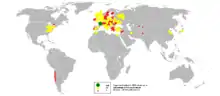 Franz Karl Achard opened the world's first beet sugar factory in 1801, at Kunern, Silesia (now Konary, Poland).[10] The idea to produce sugar from beet was soon introduced to France, from whence the European sugar beet industry rapidly expanded. By 1840, about 5% of the world's sugar was derived from sugar beets, and by 1880, this number had risen more than tenfold to over 50%.[13] In North America, the first commercial production started in 1879 at a farm in Alvarado, California.[14][15] The sugar beet was introduced to Chile by German settlers around 1850.[15]