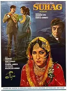Suhag is a 1972 Pakistani film directed by Fareed Ahmed and produced by Shamim Ara under banner Shamim Ara Productions. Ara also played the lead role in the film opposite Nadeem and Zia Mohyeddin. The film was based on Hameeda Jabeen novel Saemi. Music was composed by Nashad. Nadeem played a villainous role in the film. The film was commercially unsuccessful.[1][2][3]