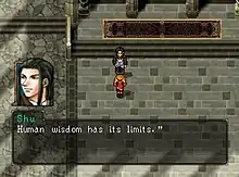 Suikoden II is a role-playing video game with strategic elements, with multiple gameplay formats ranging from one-on-one combat to large scale confrontations between two armies. The player controls a silent protagonist, advancing the plot by completing tasks and talking with other characters. The player can also recruit over 100 new characters to his cause, often involving a short sidequest to do so. In towns, the player can gather information, sharpen characters' weaponry, and buy equipment and runes; wilderness areas generally feature random encounters with monsters.