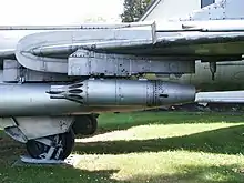 Operationally, Su-7s were hampered by a high landing speed of 340–360 km/h.[4] This was dictated by the highly swept wing. Combined with poor visibility from the cockpit and the lack of an instrument landing system, operations were very difficult, especially in poor weather or airfields.[5] In 1961–1962, Sukhoi experimented with blown flaps on S-25 but the benefit was too small to warrant implementation. JATO rockets tested on S-22-4 proved more useful and were incorporated into the Su-7BKL. Attempts to improve takeoff and landing performance eventually resulted in the variable geometry Sukhoi Su-17