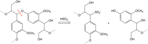 Most of the intermediates involved in delignification in sulfite pulping are resonance-stabilized carbocations formed either by protonation of carbon-carbon double bonds or acidic cleavage of ether bonds which connect many of the constituents of lignin. It is the latter reaction which is responsible for most lignin degradation in the sulfite process.[2] The electrophilic carbocations react with bisulfite ions (HSO3−)to give sulfonates.