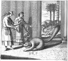 An engraving from Athanasius Kircher's book China Monumentis, Qua Sacris qua Profanis (1666) describes the sumxu as cat-like, but the illustration resembled a small bear with a bushy tail. The engraving is clearly based on a picture in Boym's Flora Sinensis, where the picture is captioned as 松鼠 in Chinese (this is Chinese for "squirrel"; the word is transcribed songshu in modern Hanyu Pinyin, but sumxu was the standard way of transcribing these syllables in the 17th century Jesuit literature) and sum xu in Latin. Kircher's description, if not sheer fantasy, may have been based on reports of other writers (as detailed below) who refer to the creature as a droop-eared cat.