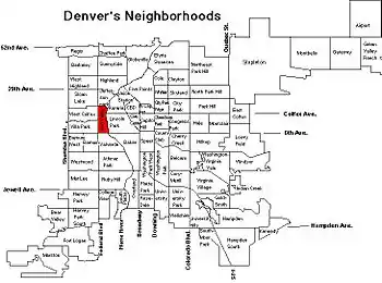 Lakewood Gulch traverses the neighborhood, ending at the South Platte River just south of Colfax Avenue. The gulch travels through Rude Park at the west side of the neighborhood. The park contains a recreation center, bike paths, and a baseball field. The bike path meets the gulch between Decatur Street and the South Platte, but has been closed since 2007 because of a flash flood there that took the life of a toddler.[2] Sun Valley contains a single stop (the Decatur-Federal station) of the FasTracks West Corridor Light Rail line at Decatur Street.