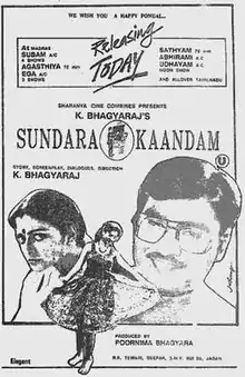 Sundara Kandam (transl. The Beautiful Chapter) is 1992 Indian Tamil-language romantic comedy film, written and directed by K. Bhagyaraj, and produced by his wife Poornima. The film stars Bhagyaraj, Bhanupriya and Sindhuja. It revolves around a student (Sindhuja) who loves her teacher (Bhagyaraj), but he does not reciprocate.