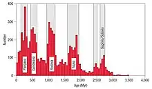Granites and detrital zircons have notably similar and episodic appearances in the rock record. Their fluctuations correlate with Precambrian supercontinent cycles. The U–Pb zircon dates from orogenic granites are among the most reliable aging determinants. Some issues exist with relying on granite sourced zircons, such as a lack of evenly globally sourced data and the loss of granite zircons by sedimentary coverage or plutonic consumption. Where granite zircons are less adequate, detrital zircons from sandstones appear and make up for the gaps. These detrital zircons are taken from the sands of major modern rivers and their drainage basins.[4] Oceanic magnetic anomalies and paleomagnetic data are the primary resources used for reconstructing continent and supercontinent locations back to roughly 150 Ma.[6]