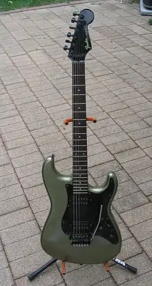 Superstrat is a name for an electric guitar design that resembles a Fender Stratocaster but with differences that clearly distinguish it from a standard Stratocaster, usually to cater to a different playing style. Differences typically include more pointed, aggressive-looking body and neck shapes, different woods, increased cutaways (resulting in deeper horns) to facilitate access to the higher frets, increased number of frets, contoured heel facilitating easier higher fret access, usage of humbucking pickups and locking vibrato systems, most commonly the Floyd Rose.[1][2][3]
