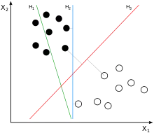 In machine learning, support vector machines (SVMs, also support vector networks[1]) are supervised learning models with associated learning algorithms that analyze data for classification and regression analysis. Developed at AT&T Bell Laboratories by Vladimir Vapnik with colleagues (Boser et al., 1992, Guyon et al., 1993, Cortes and Vapnik, 1995,[1] Vapnik et al., 1997) SVMs are one of the most robust prediction methods, being based on statistical learning frameworks or VC theory proposed by Vapnik (1982, 1995) and Chervonenkis (1974). Given a set of training examples, each marked as belonging to one of two categories, an SVM training algorithm builds a model that assigns new examples to one category or the other, making it a non-probabilistic binary linear classifier (although methods such as Platt scaling exist to use SVM in a probabilistic classification setting). SVM maps training examples to points in space so as to maximise the width of the gap between the two categories. New examples are then mapped into that same space and predicted to belong to a category based on which side of the gap they fall.