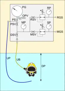 The pneumo line is usually a 0.25 inches (6.4 mm) bore hose in the diver's umbilical, supplied with breathing gas from the gas panel via a supply valve. Downstream from the valve there is a branch to a high resolution pressure gauge, a restriction to flow to the gauge, and an overpressure relief valve to protect the gauge from full panel supply pressure in case the pneumo line is used for emergency breathing gas supply. Each diver has an independent pneumofathometer, and if there is a bell, it will also have an independent pneumofathometer.[37]