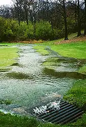 Urban runoff is surface runoff of rainwater, landscape irrigation, and car washing[21] created by urbanization. Impervious surfaces (roads, parking lots and sidewalks) are constructed during land development. During rain, storms, and other precipitation events, these surfaces (built from materials such as asphalt and concrete), along with rooftops, carry polluted stormwater to storm drains, instead of allowing the water to percolate through soil.[22] This causes lowering of the water table (because groundwater recharge is lessened) and flooding since the amount of water that remains on the surface is greater.[23][24] Most municipal storm sewer systems discharge untreated stormwater to streams, rivers, and bays. This excess water can also make its way into people's properties through basement backups and seepage through building wall and floors.