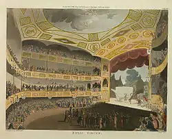 The Royal Circus was opened on 4 November 1782 by the composer and song writer, Charles Dibdin (who coined the term "circus" for that usage),[1] aided by Charles Hughes, a well-known equestrian performer. The entertainments were at first performed by children with the goal of its being a nursery for young actors. Delphini, a celebrated buffo, became manager in 1788 and produced a spectacle including a real stag-hunt. Other animal acts followed, including the popular dog act Gelert and Victor, lecture pieces, pantomimes and local spectacles. The popular comedian John Palmer then managed the theatre until 1789,[2] when he was committed to Horsemonger Lane Gaol as "a rogue and a vagabond".[3]