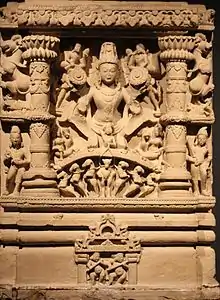 Many of the temples that contain Surya icons and artwork are dated to the second half of the 1st millennium BCE and early centuries of the 2nd millennium. The 11th-century Vaishnava temple at Kadwaha in Madhya Pradesh, for example, features a Surya artwork along with many other gods and goddesses at its doorway.[65] The 8th and 9th century goddess (Shaktism) temples of central India, similarly engrave Surya along with other Hindu gods within the temple.[65] The six century Shiva temple at Gangadhar in Rajasthan includes Surya.[67] Similar mentions are found in stone inscriptions found near Hindu temples, such as the 5th century Mandasor inscription.[68] These temples, states Michael Meister, do not glorify one god or goddess over the other, but present them independently and with equal emphasis in a complex iconography.[65]