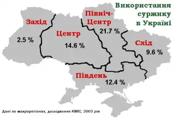 According to data presented by the Kyiv International Institute of Sociology in 2003, 11% to 18% of the people of Ukraine were found to communicate in Surzhyk. Specifically, in western Ukraine, Surzhyk is spoken by 2.5% of the population, while in the south, it is spoken by over 12.4% of the population. In the east, 9.6% of the population speaks Surzhyk. As Western Ukraine has a higher ratio of Ukrainian speakers to Russian speakers than the rest of Ukraine, the lesser proportion of Surzhyk speakers compared with the east and south is understandable.[2]