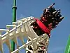 There are several different layouts of Suspended Looping Coasters although most feature a similar pattern.[2] The ride starts by taking riders up a 33.3-metre (109 ft) chain lift hill.[5] Once at the top, the train drops down a steep, banked right turn where it enters the first inversion element - a right rollover. A rollover is an Immelmann loop followed by a Dive Loop[6] After exiting this element, the train traverses a tall, banked left turn and approaches the ride's next inversion - a left sidewinder.[5] A sidewinder is similar to an Immelmann loop; however, it features a half-loop followed by a half-corkscrew (rather than an inline twist).[7] After exiting the sidewinder, the train navigates a 270o right upwards helix before entering the ride's final two inversions - a double inline twist. A banked 90o turn to the right then turns the train back around to face towards the station. At this point, some models feature an additional helix to the left, while others simply continue straight into the brake run.[5] The standard model also has a relatively compact layout, providing numerous "footchoppers".