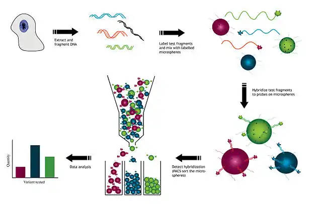 DNA is extracted from cells used to create test fragments. These test fragments are added to a solution containing a variety of microsphere beads. Each type of microsphere bead contains a known DNA probe with a unique fluorescent identity. Test fragments and probes on the microsphere beads are allowed to hybridize to each other. Once hybridized, the microsphere beads are sorted, usually using flow cytometry. This allows for the detection of each of the gene variants from the original sample. The resulting data collected will indicate the relative abundance of each hybridized sample to the microsphere.