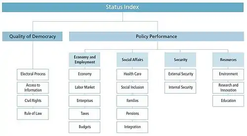 - The first dimension of the Status Index maps the quality of democracy within a country and examines four criteria: "Electoral Process," "Access to Information," "Civil Rights," and "Rule of Law."