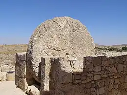 Susiya is the site of an archaeologically notable ancient synagogue.[2] The site was examined by Shmarya Guttman in 1969, who uncovered the narthex of a synagogue during a trial dig. He, together with Ze'ev Yeivin and Ehud Netzer, then conducted the Israeli excavations at Khirbet Suseya, (subsequently named by a Hebrew calque as Horvat Susya) over 1971–72,[30][31][32] by the Palestinian village of Susiya Al-Qadime.