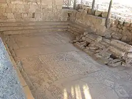 The synagogue was built as a broadhouse, rather than along basilica lines,[40][41] measuring 9 by 16 metres (27 by 48 feet)[30] built in well-wrought ashlar construction, with triple doorway façade in an eastward orientation, and the bimah and niche at the centre of the northern wall. There was a secondary bimah in the eastern section. Unlike other synagogues in Judea it had a gallery, made while reinforcing the western wall. East of the synagogue was an open courtyard surrounded on three sides by a roofed portico. The western side opened to the synagogue's narthex, and the floor of the narthex composed of coloured mosaics set in an interlaced pattern. This model was of short duration, yielding in the late Byzantine phase (6th/7th) to the basilica form, already elsewhere dominant in synagogue architecture.[42]