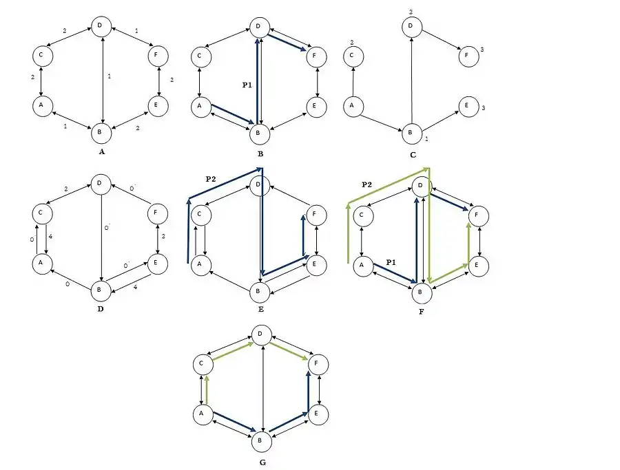 Figure G finds the shortest pair of disjoint paths by combining the edges of paths P1 and P2 and then discarding the common reversed edges between both paths (B–D). As a result, we get the two shortest pair of disjoint paths (A–B–E–F) and (A–C–D–F).