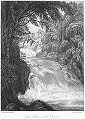 It was suggested in 1899 that the falls could be used to generate electricity for the nearby village of Betws-y-Coed, as well as overhead lighting for the falls.[2] In 1913 the second Lord Ancaster, the landowner, gave the Swallow Falls to the local council, who decided to charge for visiting it in order to pay off some of the £15,000 debt incurred through the installation of water and electricity supplies to the village. Once the debt of costs of installation was cleared the parish retained the fee, resulting in Betws-y-Coed having the lowest rates in the country.[3] By the 1930s, the waterfall had become a popular tourist destination, although there were few visitors during the winter off-season. A writer in the Yorkshire Post and Leeds Intelligencer on 17 January 1933, described the waterfall as coming "over the rocks in a perfect torrent, peerless white in the dusk."[4]