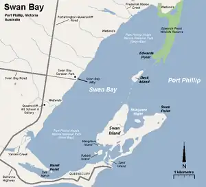 The Swan Bay is a shallow, 30-square-kilometre (12 sq mi) marine embayment at the eastern end of the Bellarine Peninsula in Port Phillip, Victoria, Australia. The township of Queenscliff lies at its southern end, and St Leonards at its northern. It is partly separated from Port Phillip by Swan Island, Duck Island and Edwards Point. Most of the area is included in the Port Phillip Heads Marine National Park as well as being listed as a wetland of international importance under the Ramsar Convention as part of the Port Phillip Bay (Western Shoreline) and Bellarine Peninsula Ramsar Site.[2] The bay is part of the Swan Bay and Port Phillip Bay Islands Important Bird Area, identified as such by BirdLife International because of its importance for orange-bellied parrots, waders and seabirds.[3]