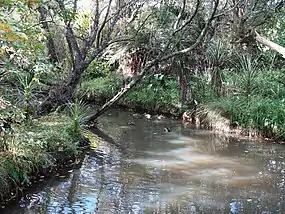The stream is a habitat for the New Zealand longfin eel, the short-finned eel, cran's bully, common bully (toitoi), redfin bully, New Zealand smelt, banded kōkopu, common galaxias (īnanga) and torrentfish (panoko).[2] The land adjacent to the stream form an alluvial flood zone, which was historically forested by tōtara, tītoki and west coast kōwhai.[5]