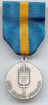 Swedish Armed Forces Basic Training Medal (Swedish: Försvarsmaktens grundutbildningsmedalj, FMGUSM), previously the Swedish Armed Forces Conscript Medal (Swedish: Försvarsmaktens värnpliktsmedalj, FMvplSM[1][3][note 1]) is a Swedish reward medal instituted by the Swedish Armed Forces and was awarded to conscripts.
