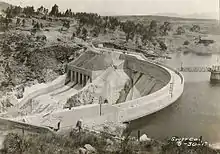 A total of 20,507 cubic yards (15,679 m3) of material were used in the construction of the dam, including 17,562 barrels of cement. The total cost came to $234,074.11, including preliminary investigations and purchase of the land to be flooded by the reservoir.[14] The dedication ceremony was on April 19, and over three thousand people came to watch. At that time, the dam was the highest masonry arch dam in the United States and was considered an engineering marvel and tourist attraction.[15]