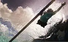 Swimming is the self-propulsion of a person through water, or other liquid, usually for recreation, sport, exercise, or survival. Locomotion is achieved through coordinated movement of the limbs and the body to achieve hydrodynamic thrust that results in directional motion. Humans can hold their breath underwater and undertake rudimentary locomotive swimming within weeks of birth, as a survival response.[1]