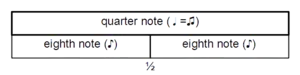 In swing rhythm, the pulse is divided unequally, such that certain subdivisions (typically either eighth note or sixteenth note subdivisions) alternate between long and short durations. Certain music of the Baroque and Classical era is played using notes inégales, which is analogous to swing. In shuffle rhythm, the first note in a pair may be twice (or more) the duration of the second note. In swing rhythm, the ratio of the first note's duration to the second note's duration can range: The first note of each pair is often understood to be twice as long as the second, implying a triplet feel, but in practice the ratio is less definitive and often much more subtle.[9] In traditional jazz, swing is typically applied to eighth notes. In other genres, such as funk and jazz-rock, swing is often applied to sixteenth notes.[10][11]