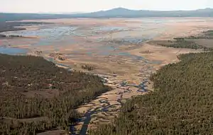 Downstream of Currier Creek, Paradise Creek enters from the left, and the Sycan turns northwest and then north, leaving Klamath County and re-entering Lake County. Slightly north of the border, Long Creek enters from the right. After turning west and southwest,[6] the river enters Sycan Marsh, a wetland of about 50 square miles (130 km2).[8] Continuing southwest through the marsh, the river leaves Lake County and re-enters Klamath County. Further downstream, Merritt Creek enters from the left. Meandering west and then south, the Sycan receives Blue Creek from the left, enters Sprague River Valley, receives Snake Creek from the left, and enters the Sprague River north of Beatty.[6]