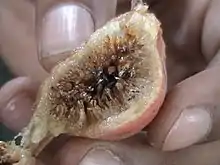 Once pollinated by a fig wasp, the individual florets inside the syconium develop into achenes or drupes, in which the seeds are enclosed by a layer of endocarp. From this perspective, the fig is an enclosure with tens to thousands of fruits within it.[3]