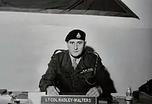Radley-Walters was commissioned a second lieutenant in the Sherbrooke Fusilier Regiment in October 1940.[2] The regiment was redesignated the 27th Armoured Regiment (The Sherbrooke Fusilier Regiment) in January 1942 and embarked for England in October 1942. The regiment was part of the 2nd Canadian Armoured Brigade, supporting the 3rd Canadian Infantry Division landing in Normandy on D-Day 6 June 1944. Radley-Walters commanded a Sherman tank during the Battle of Normandy. On D-Day + 1, in fighting with the 12th SS Panzer Division, near Saint-Germain-la-Blanche-Herbe, Radley-Walters had his first kill, a Panzer IV.[2] Radley-Walters commanded a tank squadron in the regiment. His unit may have killed "tank ace" Michael Wittmann of the 101st SS Heavy Panzer Battalion, though there is no definitive proof. This claim has been disputed by 3 Troop, A Squadron, 1st Northamptonshire Yeomanry tank regiment gunner Joe Ekins, who also claims to have killed Wittmann. The investigative TV program Battlefield Mysteries investigated the competing claims and concluded that, based on the measured ranges and location of the strike on Wittman's tank, one of the Sherbrooke tanks was probably responsible. Their position was 150m from Wittman, and on the same side as the strike. The Northamptonshire tanks were over a kilometer away and on the opposite side.