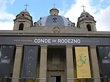 Popularly known as the Monument to the Fallen, the actual name of this monument is Navarra a sus Muertos en la Cruzada (Navarre to its Dead in the Crusade), as indicated on its facade. The building was erected in memory of the dead from Navarre, a Nationalist stronghold during the Civil War, and is located in the heart of the city of Pamplona, the capital of Navarre. The building was designed by the architects Victor Eusa and José Yamoz. The names of the 5,000 people of Navarre who died in combat in the civil war were inscribed on its walls, but today they are covered by a sheet.[66] Today the building is known as the Sala de Exposiciones Conde Rodezno (Conde Rodezno Exhibition Hall) and is used for small municipal exhibitions.[67]