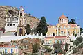 Clockwise from top: View of Ano Symi, Gyalou Square, Monastery of the Archangel Michael Panormitis, Annunciation Church, stairs of Ano Symi, Port of Symi, sample of a traditional Neoclassical house | |