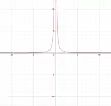 Again, for this function the symmetric derivative exists at , while its ordinary derivative does not exist at due to discontinuity in the curve there. Furthermore, neither the left nor the right derivative is finite at 0, i.e. this is an essential discontinuity.